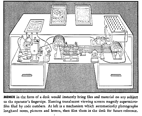 MEMEX in the form of a desk would instantly bring files and material on any subject to the operator’s fingertips. Slanting translucent viewing screens magnify supermicro-film filed by code numbers. At left is a mechanism which automatically photographs longhanf notes, pictures and letters, then files them in the desk for future reference.
